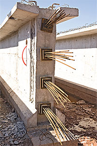 | Viga após concretagem com as cordoalhas | Macaco hidráulico que fará a protensão |